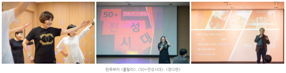 나비넥타이 나병인 졸업생의 화끈한 사회로 라인댄스 ‘룰랄라’의 공연과 영화커뮤니티 ‘50+전성시대’, 바른먹거리를 알리는 ‘햇살부엌연구소’,