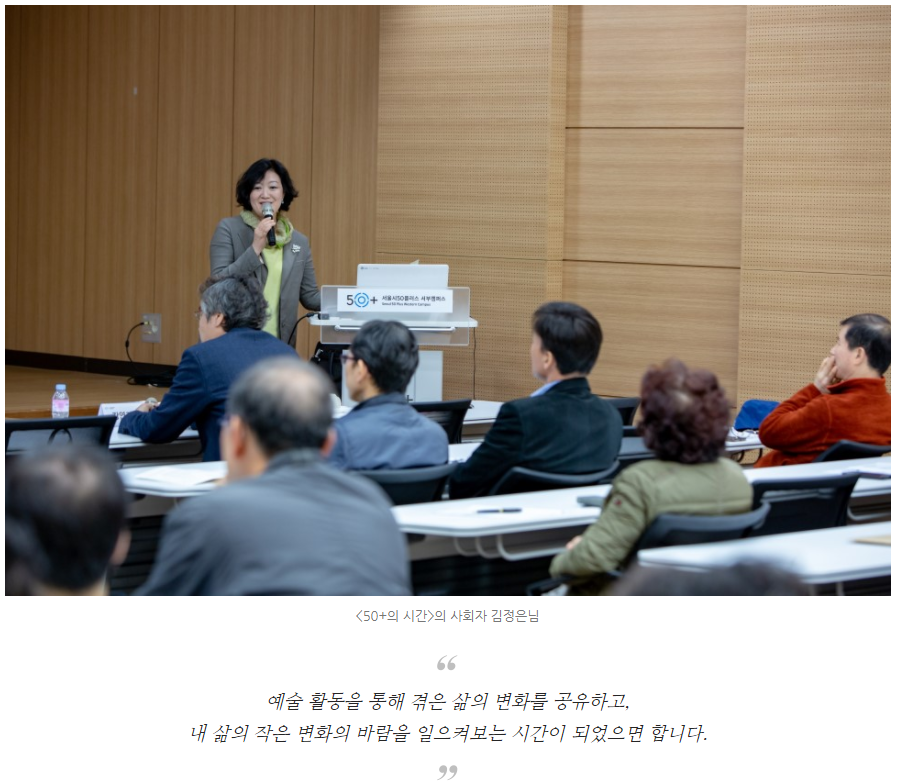 <50+의 시간>은 서부캠퍼스가 매 학기마다 진행하는 명사특강. 50+세대가 가지고 있는 고민들을 명사들과 함께 풀어보는 인기 특강인데,