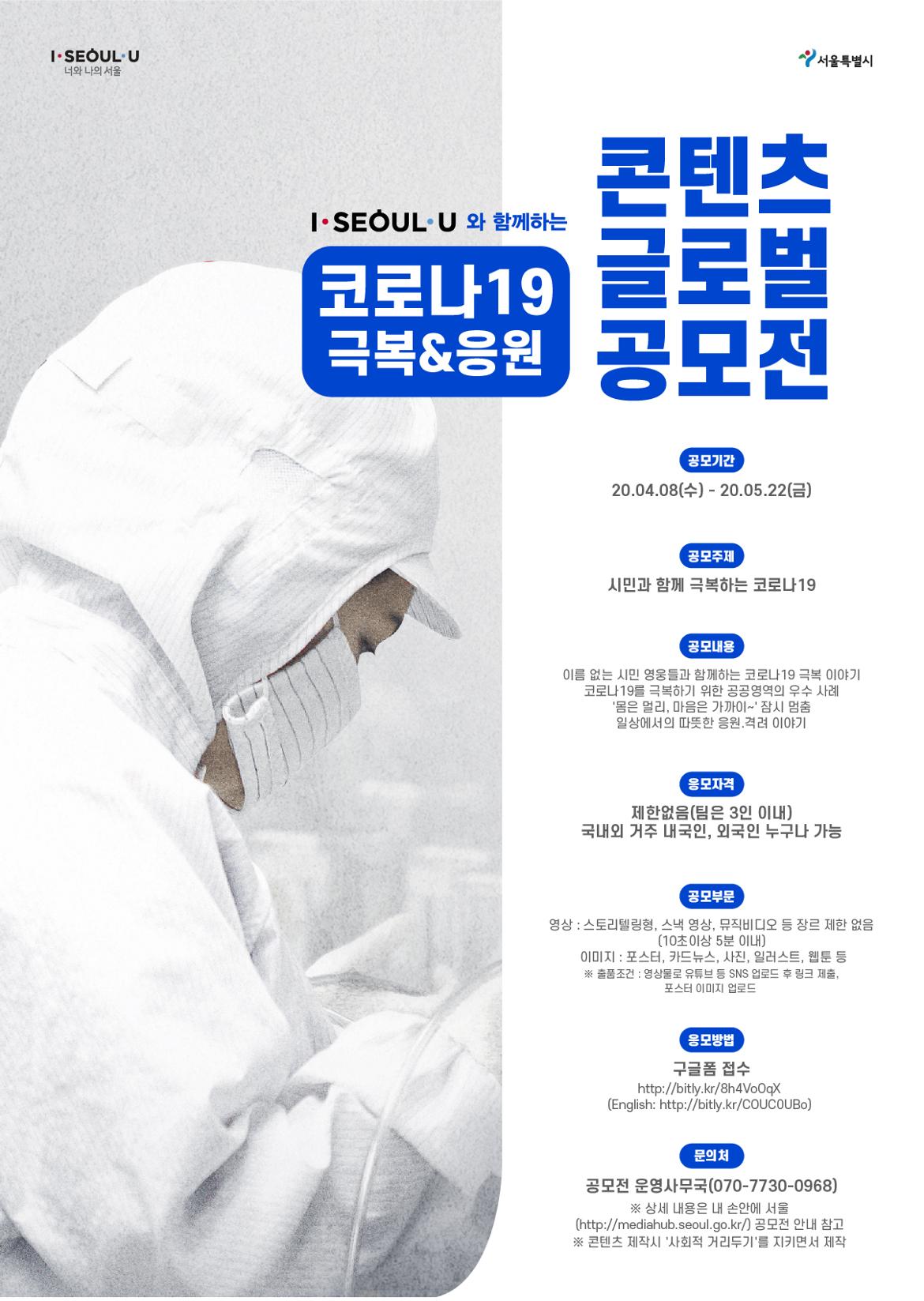 서울특별시에서는 시민과 함께 코로나19를 극복하기 위하여 「코로나19 극복·응원 콘텐츠 글로벌 공모전」을 실시합니다. 이름없는 영웅들의 이야기, 잠시 멈춤 일상에서의 따뜻한 이야기, 민관영역에서의 우수 사례 등 「코로나19 극복·응원 콘텐츠 글로벌 공모전」에 관심 있는 분들의 많은 참여 바랍니다.
