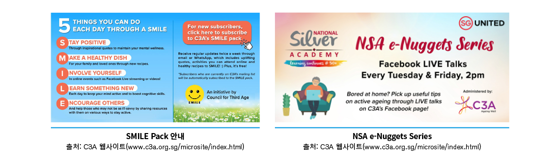 사무실 휴관 동안 C3A는 회원들에게 매주 2회씩 SMILE Pack이라는 슬로건을 이메일과 왓츠앱으로 보내고 있다. 비록 회원들이 집에 머물고 있지만 활기차게 보내기 위하여 S(Stay Positive), M(Make a Healthy Dish), I(Involve Yourself), L(Learn Something New), E(Encourage Others)라는 이니셜을 딴 SMILE Pack 슬로건을 내걸고 있는데 I(Involve Yourself)의 활동이 Facebook 라이브 스트리밍이나 비디오를 통한 온라인 이벤트에 참여하도록 하는 것이다. 그 구체적인 내용은 페이스북을 통한 e-Nuggets Series 라이브로 참여할 수 있다. NSA e-Nuggets Series는 COVID-19로 오프라인 교육을 진행할 수 없는 기간에 e-Learning을 촉진하기 위한 지속적인 노력의 일환으로 실행되는 것으로 엑티브 에이징을 위한 라이브 토크 프로그램이다.