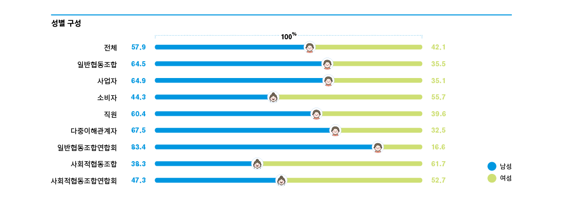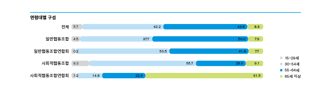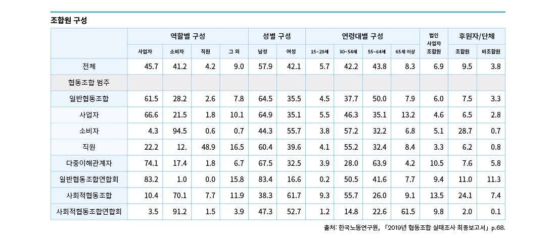 ‘협동조합기본법(2012년 12월 1일)’ 시행은 협동조합의 경제활동을 ‘협동으로 영위하고, 조합원의 권익을 향상하며, 지역사회에 공헌하는 사업조직’으로 정의한다. 이러한 법에 따라 기본법 협동조합은 5명 이상이 모이면 출자금 제한 없이 법인을 설립할 수 있어, 젊은 층은 물론 퇴직 이후 개인에게 가중되던 새로운 삶에 대한 사회적 선택의 제약(자영업, 단순 노동 일자리로 대변되던)이 확장되어 내 일자리는 물론 우리의 일자리와 협력 노동의 공간을 만들 수 있는 장점을 가지고 있다. 2019년 기획재정부에서 실시한 전국 협동조합 실태조사에 따르면 전국 3,179개 표본 중 55세 이상 시니어들이 참여한 협동조합이 전체 협동조합의 절반이 넘는다. 또한 협동조합의 이사장 역시 50세 이상이 65.5%를 차지하면서 시니어들이 이미 협동조합을 통해 새로운 비전과 경험을 만들어 가고 있다고 일단 평가할 수 있다.