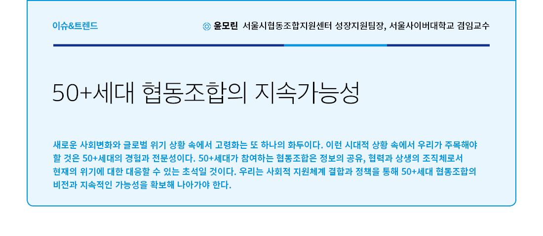 또한 2020년은 유엔이 65세 이하를 청년으로 새롭게 정의한 시점일 뿐만 아니라 문재인정부도 노인 연령 기준을 현행 65세에서 70세로 상향 조정하는 정책을 준비하고 있는 시점이다. 한 세대를 넘어 한 시대를 살아온 집단의 지식 공유와 협력의 경험들이 지속적으로 또는 새로운 공간에서 사회에 기여할 수 있도록 경제적·사회적 구조를 만들어 가는 것은 매우 중요해 보인다. 유엔에 따르면 청년 일자리 창출은 중요한 정책이 될 것이라 했고, 한국은 청년 일자리 창출뿐만 아니라 50+세대의 새로운 삶을 주조할 정책과 실천(그것이 시니어 일자리 창출 또는 경제활동 활성화로 불리던 간에)이 필요할 것이다. 그것이 자본주의의 위기이건, 기후위기이건, 지금의 전염병위기이던 간에 시장경쟁, 정보독점, 개인(회사)의 이익의 극대화와는 달리 지식과 정보의 공유, 협력과 상생의 조직체로서의 협동조합은 이러한 위기에 대한 대응의 화두를 푸는 초석이 될 수 있으며, 여기에 50+세대의 두터운 인구층을 사회적경제 전반에 참여할 수 있도록 이들의 역량을 이끌어 내는 지원과 교육은 너무나 중요해 보인다.*