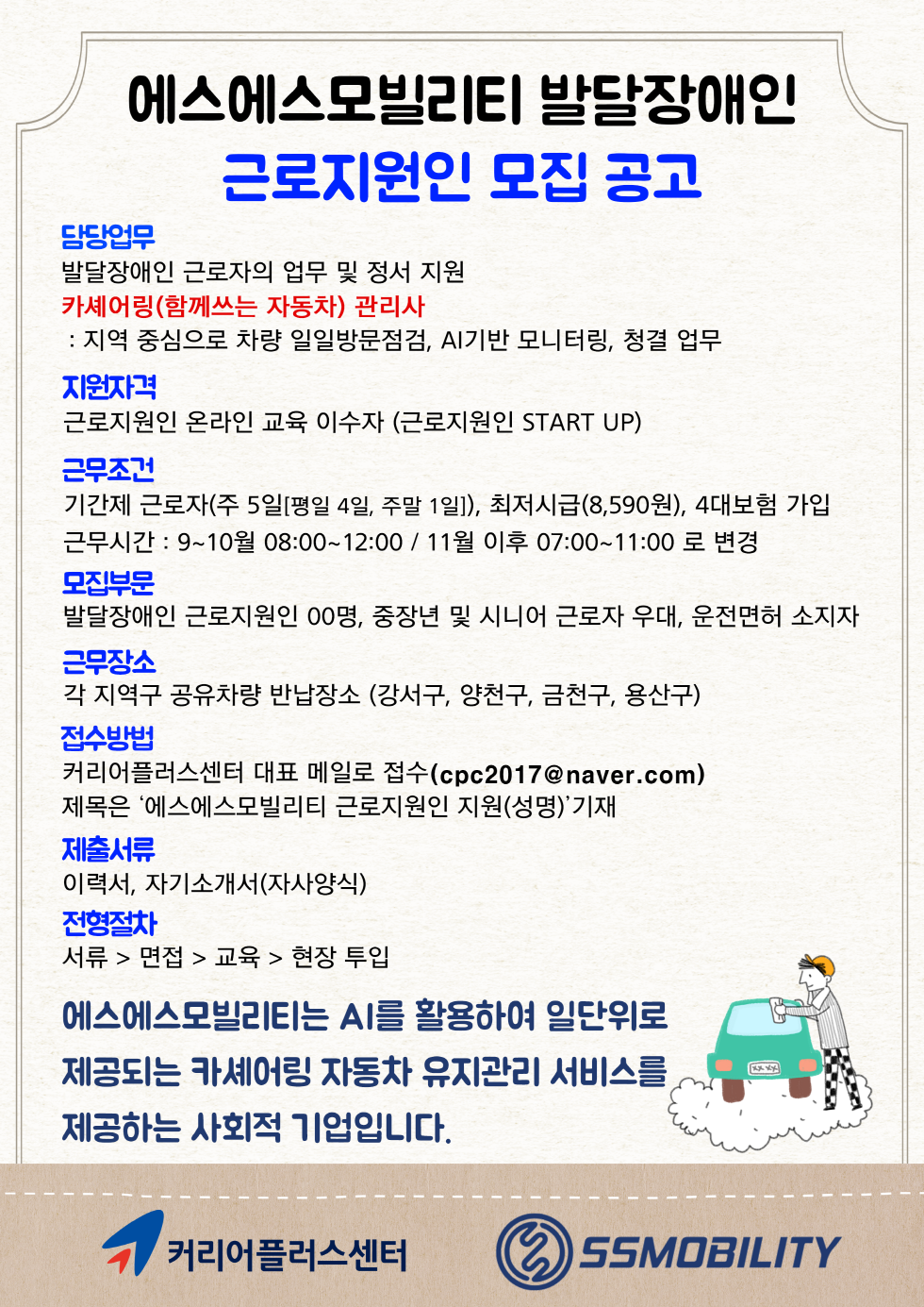 [에스에스모빌리티] 발달장애인 근로지원인 모집 공고(~9.25)