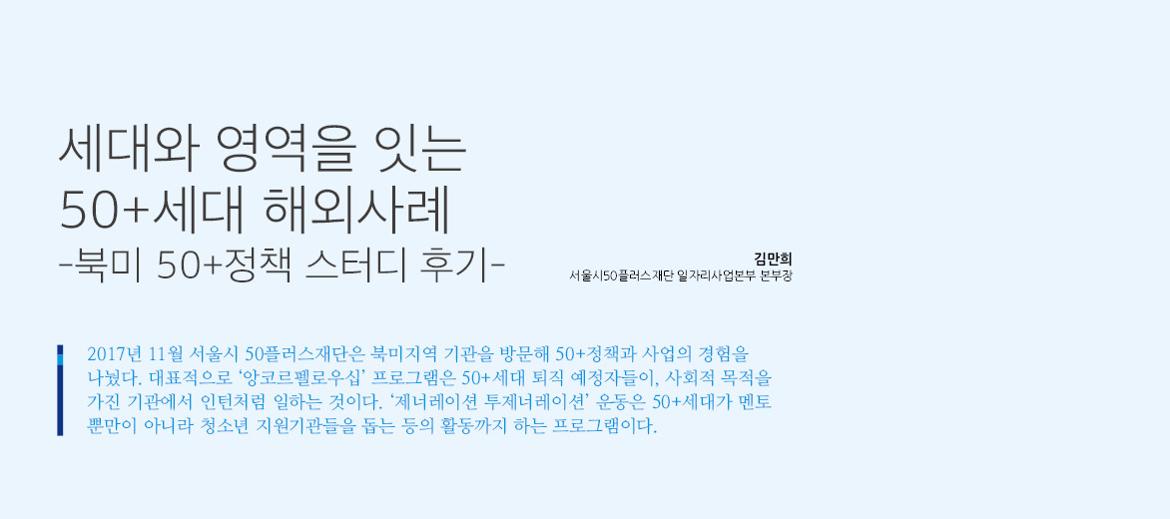 2017년 11월 서울시 50플러스재단은 북미지역 기관을 방문해 50+정책과 사업의 경험을 나눴다. 대표적으로 ‘앙코르펠로우십’ 프로그램은 50+세대 퇴직 예정자들이, 사회적 목적을 가진 기관에서 인턴처럼 일하는 것이다. ‘제너레이션 투제너레이션’ 운동은 50+세대가 멘토 뿐만이 아니라 청소년 지원기관들을 돕는 등의 활동까지 하는 프로그램이다.