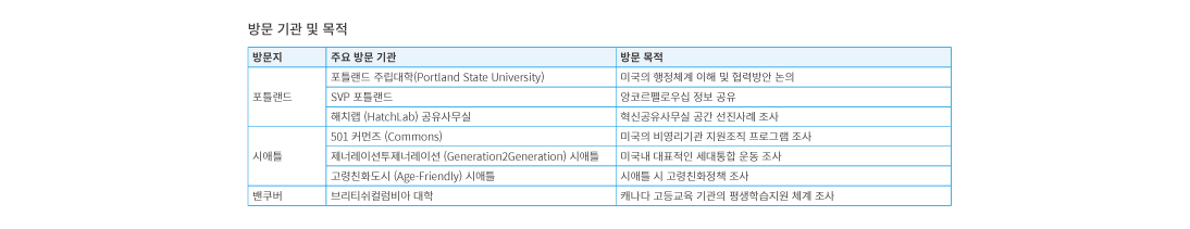 2017년 11월, 서울시50플러스재단은 우리와 유사한 고민을 하는 북미지역 기관을 방문해, 50+정책과 사업의 경험을 나누고 배우는 시간을 가졌다. 이번 출장의 목적은 크게 세 가지인데, 첫째 우리재단이 2018년부터 사업의 주요 주제로 선정한 ‘세대통합’의 미국판 운동인 ‘제너레이션2제너레이션’의 현황을 파악하는 것이다. 둘째, 재단의 주요 일자리 사업 중 하나인 앙코르 펠로우십(Encore Fellowship)의 선진사례를 살피고 우리의 50+펠로우십과 비교하는 것이다. 마지막으로는 50+세대 지원 인프라 및 문화를 조사하고 50+정책 관련 글로벌 네트워킹 구축이다.