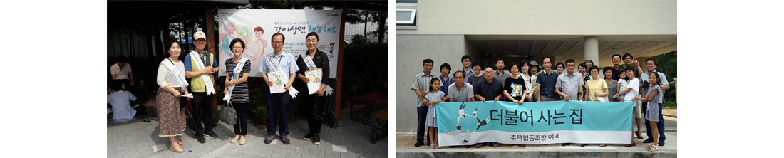 <좌. 열심히 홍보중인 50+한지붕 세대공감코디네이터, 우. 2016. 08. 여백 입주기념사진>