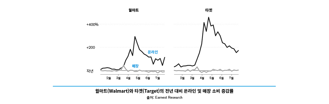 어니스트 리서치(Earnest Research)의 분석 결과에 따르면, 타겟(Target)의 매출은 온라인 매출에 중점을 두어 지난 분기에 전년 대비 약 80% 증가한 약 17억 달러의 매출을 기록하였다. 이러한 결과는 팬데믹 장기화가 온라인 소비를 촉진시키며, 향후 다양한 유통 사업에도 비대면 서비스의 시행이 소비 심리를 자극하는 데 영향을 미칠 것으로 보인다.