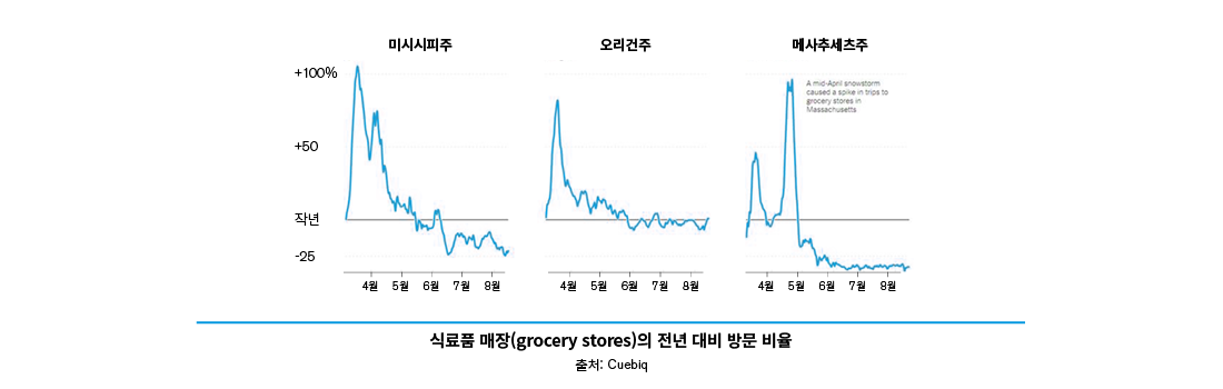 미국 내 각 주마다의 전염병 발생 지역 및 속도는 상이하며, 사람들의 전염병 위협 인지 수준에 따라 소비 행동 변화는 다를 수 있다. 바이러스 전파 위험에 대한 환경적 제약으로 오프라인 매장의 경우, 식당 및 편의시설 내의 좌석 배치 및 일부 서비스의 이용 제한과 같은 규제들이 행해졌다. 이러한 환경적 제약과 위축된 소비 심리로 전년 대비 오프라인 매장의 수동적인 소비 행동을 확인할 수 있었다. 외식문화와 관련하여, 미국 내 오프라인의 매장의 감소율은 지난해 대비 극명한 차이를 보이고 있다. 하단의 그래프는 Cuebiq의 분석 결과로 미국의 Mississipi, Oregon, Massachustts의 전년대비 증감률을 나타내며, 식당(restaurant) 및 바(bar)의 작년 대비 이용 변화율을 종단적으로 보여준다. 공통적으로 팬데믹 선언과 이용 규제가 가시화된 4월을 기점으로 매장 이용률이 급격하게 하락하였다. 또한, 오프라인 매장의 이용에 대해 4월 대비 감소율의 폭은 줄고 있으나, 작년 대비 이용률은 지속적으로 하락하는 추세를 보인다.