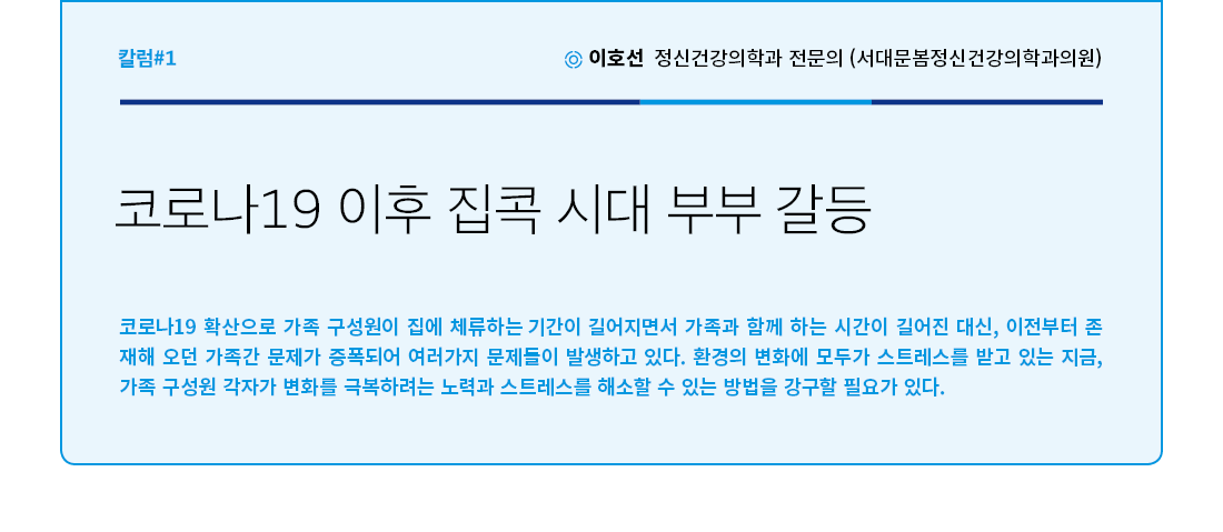 환경이 변화하면 적응하는 시간이 필요한 것이 당연하다. 코로나19 사태로 인해 너무 갑작스럽게 생활환경이 변화하여 어떻게 그 상황에 적응해야 할지, 어떻게 스트레스를 관리해야 할지 혼란스러울 수 있다. 이때 서로에게 큰 힘을 줄 수 있는 존재가 바로 가족이 되어야 하며 그 중심에는 부부가 있어야 한다.