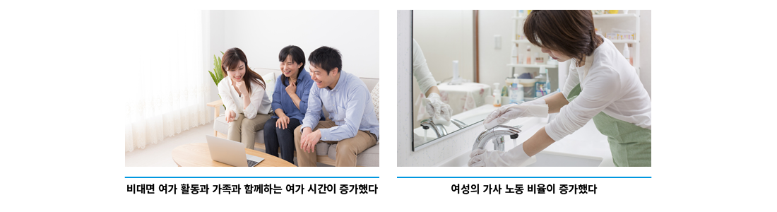 특히 개인적 여가 시간은 전체 집단으로 봤을 때 코로나19 전후에 유의한 차이가 없지만, 성별로 비교해 보면 남성은 개인적인 여가가 증가한 반면 여성은 감소하였다. 즉 코로나19 확산이라는 위기 상황이 가정 내 가사와 자녀 돌봄의 의무를 여성에게 더욱 전가하는 방식으로 작용하고 있음을 살펴볼 수 있다.