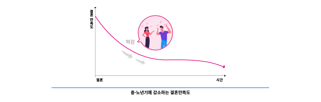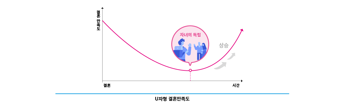 과거 1970~80년대 결혼에 대한 연구 자료를 살펴보면 결혼만족도는 결혼 이후 U자형 형태를 보이는데, 첫 자녀 출산 이후 자녀 양육시기 동안 감소하던 결혼만족도가 자녀의 독립 등으로 중⋅노년기에 접어들면서 다시 증가하는 것이다. 이는 젊었을 때 자녀양육에 치중하던 부부 관계가 자녀의 출가 이후에 신혼기와 같은 ‘부부 중심의 가족관계’로 되돌아간다고 볼 수 있다. 혹은 젊었을 때 부부관계에서 발생했던 문제 또는 갈등이 이혼을 통해 해소되었을 가능성도 있다.