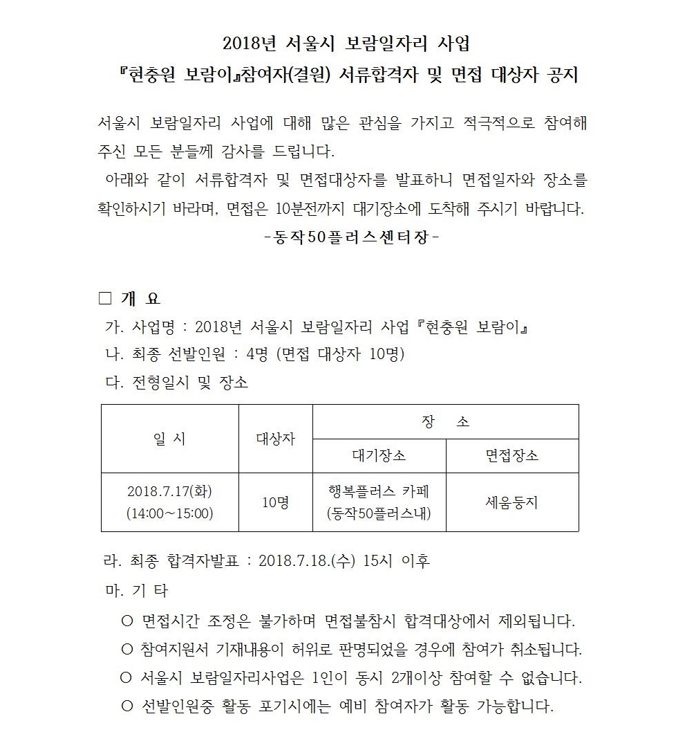 2018 보람일자리 사업 '현충원 보람이' 참여자 서류합격자 및 면접전형 공고