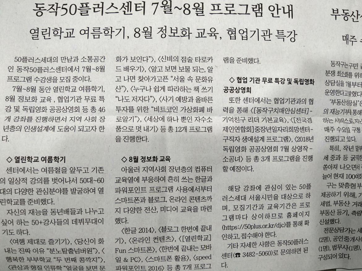 서울시 동작센터 | 180716 동작신문 동작50플러스센터 7월~8월 프로그램 안내-열린학교 여름학기, 8월 정보화 교육, 협업기관 특강