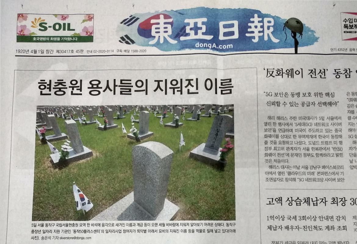 (190606 동아일보) '동작50플러스센터'의 일자리 사업 참여자가 묘비의 지워진 이름을 칠해 넣고 있다.