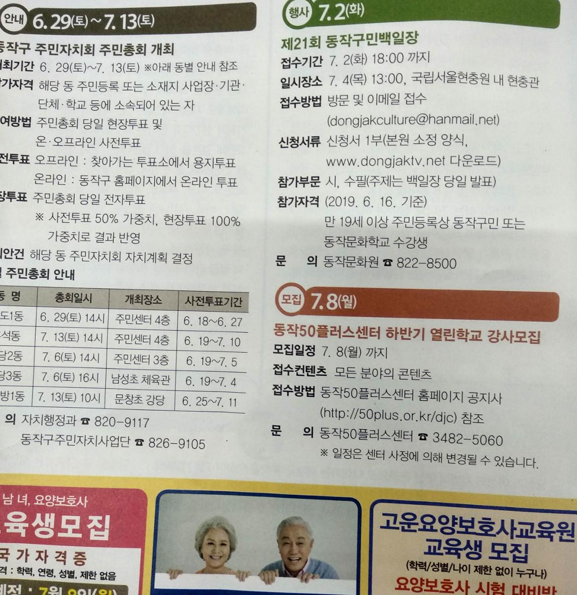 동작구 소식지 7월호, 동작 어르신 소식 여름 2019 07 제2호 (하반기 열린학교 모집 안내)