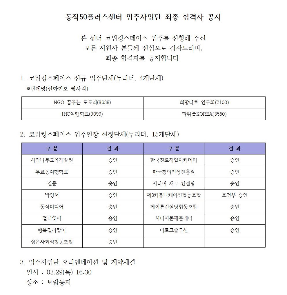 2018년 동작50플러스센터 상반기 입주사업단(코워킹스페이스) 최종결과 발표