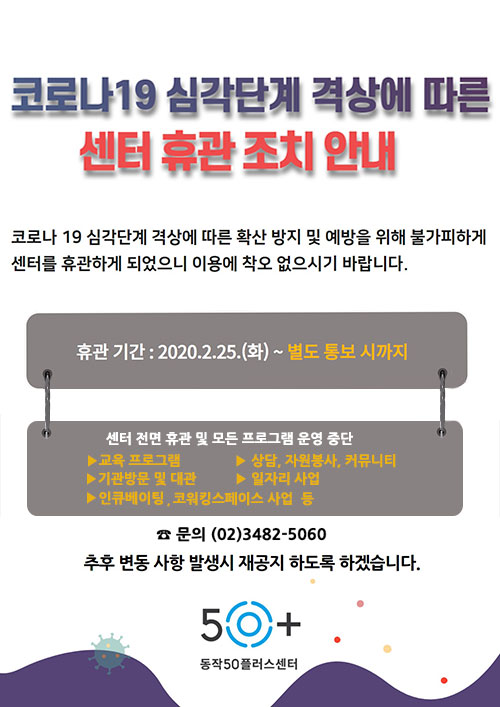 코로나 19 심각단계 격상에 따른 센터 휴관 조치 안내