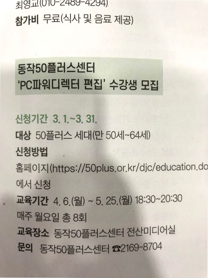 (인터넷 동작뉴스 3월 4일자)동작50플러스센터에서는 파워디렉터 PC 편집 수강생을 모집한다.