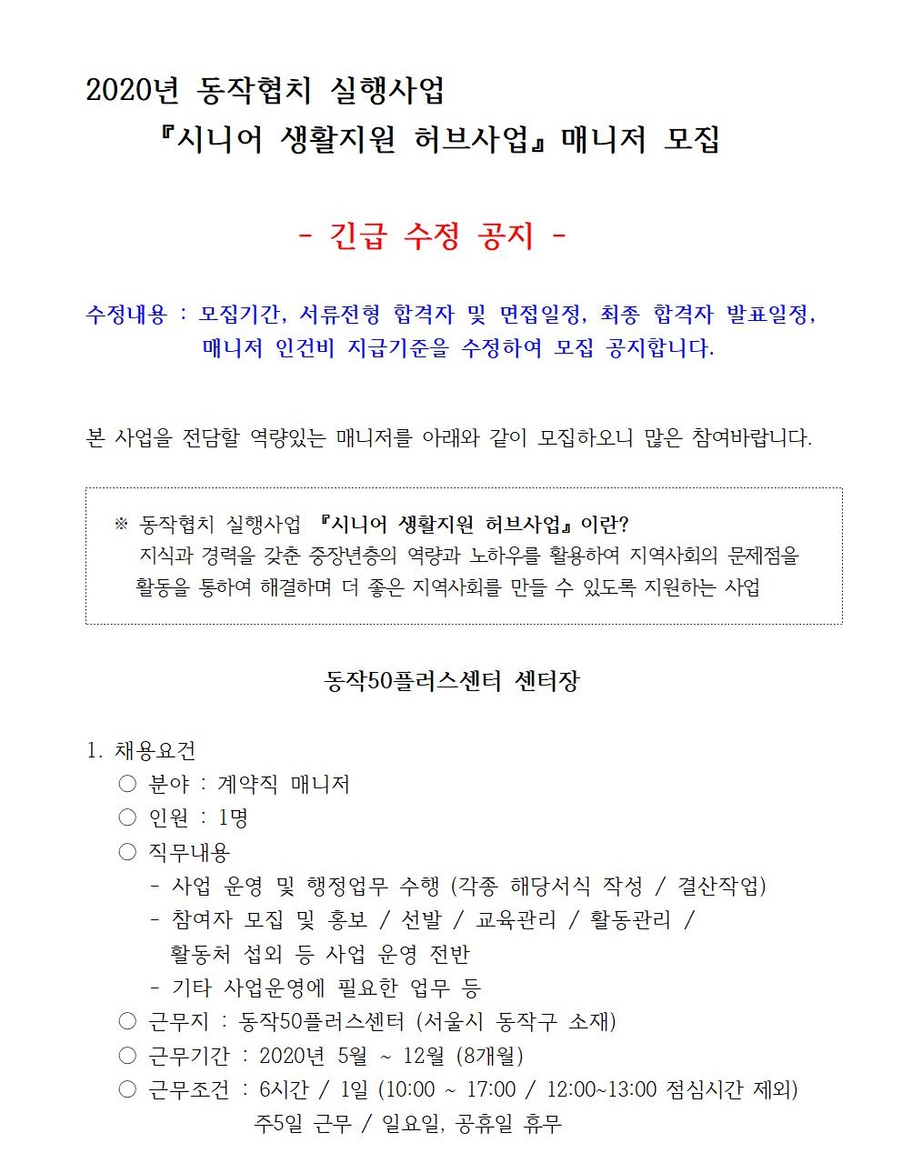 2020년 동작협치 실행사업 『시니어 생활지원 허브사업』 매니저 모집 - 수정공지