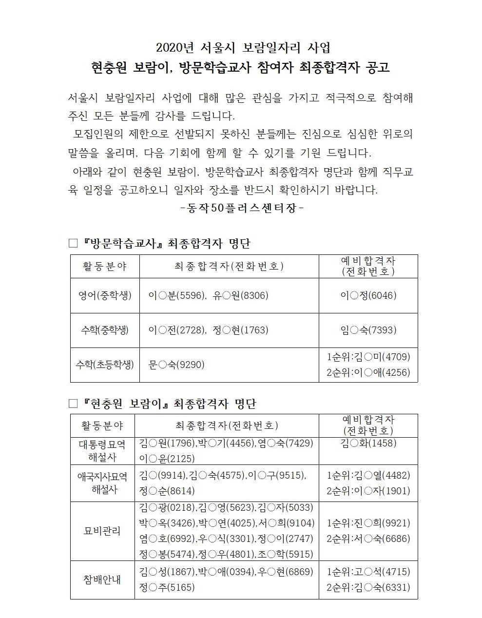 서울시 동작센터 | 2020년 서울시 보람일자리 사업 현충원 보람이 및 방문학습교사 참여자 최종합격자 공고