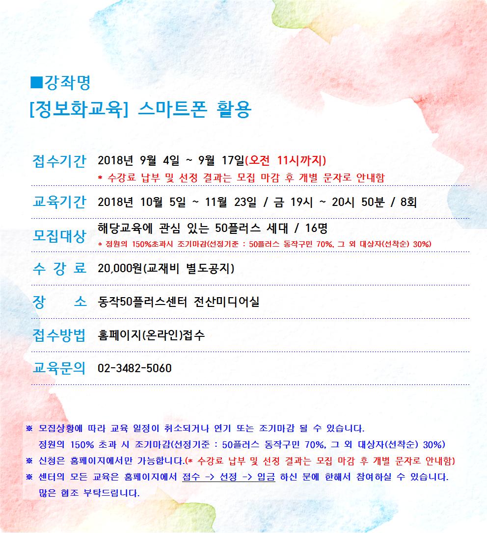 (1 회차) 2018.10.05(19:00 ~ 21:00) 5. 전산미디어실 배은미 스마트폰 기본 배우기(위젯과 설정등) 스마트폰(안드로이드)