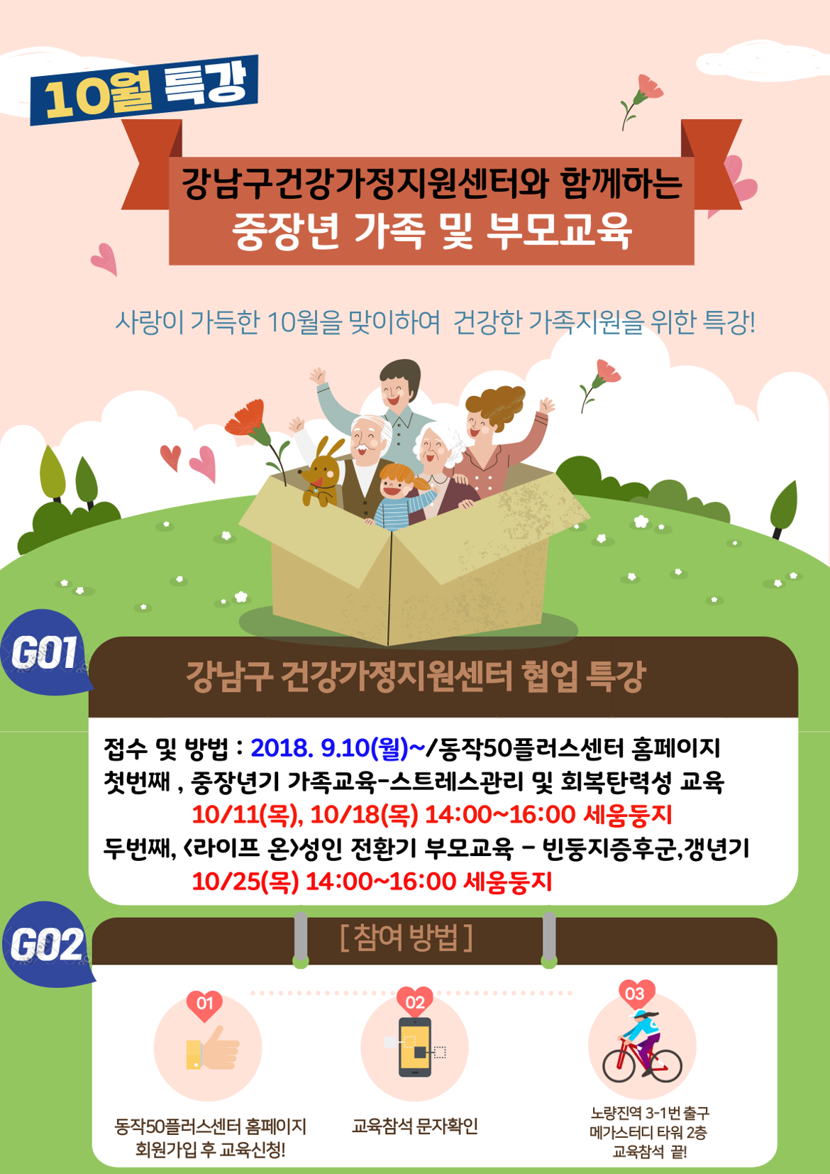 (1 회차) 2018.10.11(14:00 ~ 16:00) 1. 세움둥지 강남구건강가정지원센터 강사진 중장년기 가족교육 - 스트레스관리 및 회복 탄력성 교육(1) 필기도구