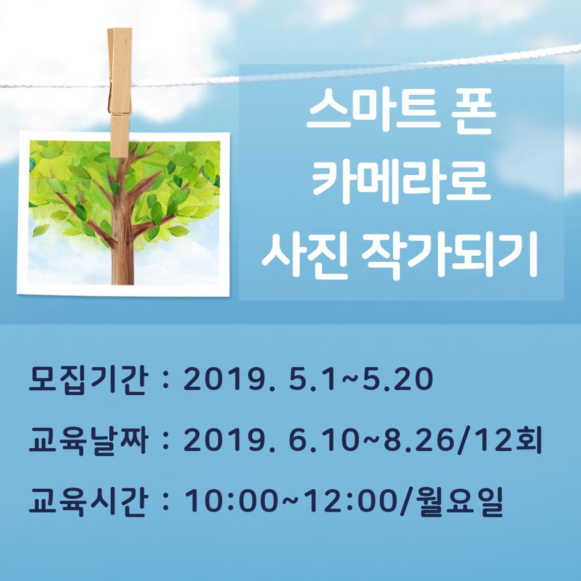(2 회차) 2019.06.17(10:00 ~ 12:00) 1. 세움둥지 윤홍선 스마트폰으로 찍는 창작 사진 – 인물, 풍경, 꽃, 스냅 스마트폰 카메라 또는 일반 카메라, 필기도구