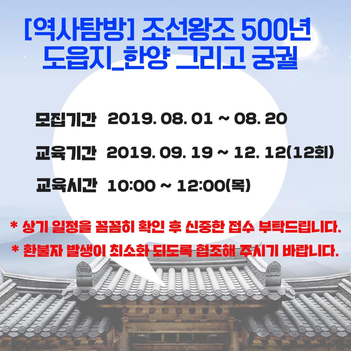 (1 회차) 2019.09.19(10:00 ~ 12:00) 1. 세움둥지 이성기 조선왕조 500년 도읍지 "한양 그리고 궁궐" 개요설명 필기구