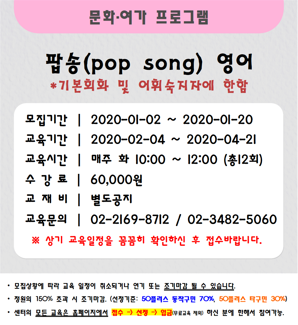 팝송 영어 (*기본회화 및 어휘숙지자에 한함.) - 조기마감