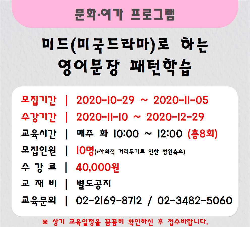 ∙ 센터의 모든 교육은 홈페이지에서 접수 -> 선정 -> 입금 (무료교육 제외) 하신 분에 한해서 참여하실 수 있습니다 . (일부 강좌 제외 )