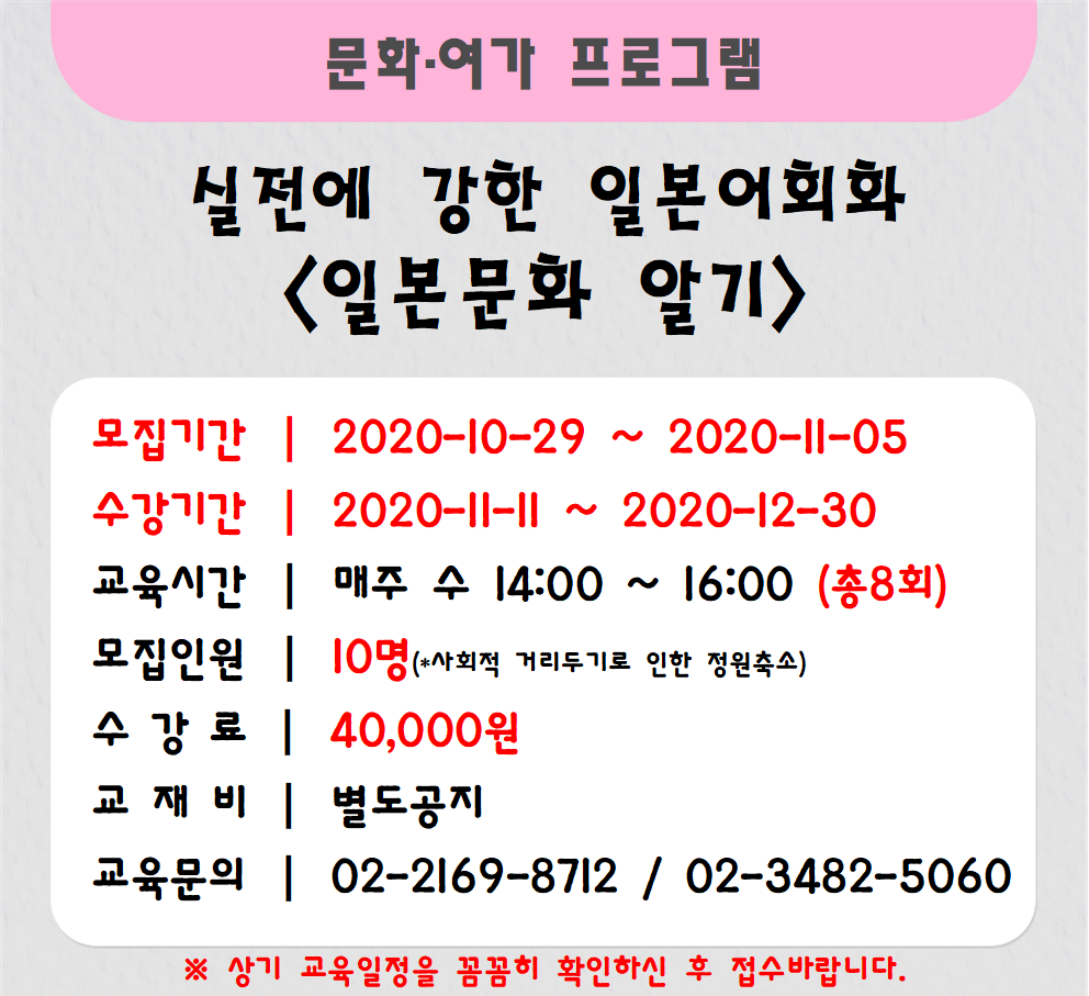 ∙ 모집인원의 70% 이하 접수 시 폐강 될 수 있습니다.