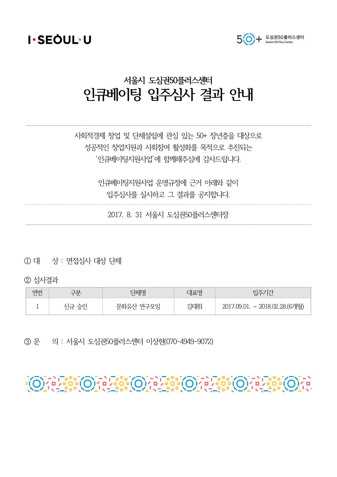 서울시 도심권50플러스센터 인큐베이팅룸 입주심사 결과 안내