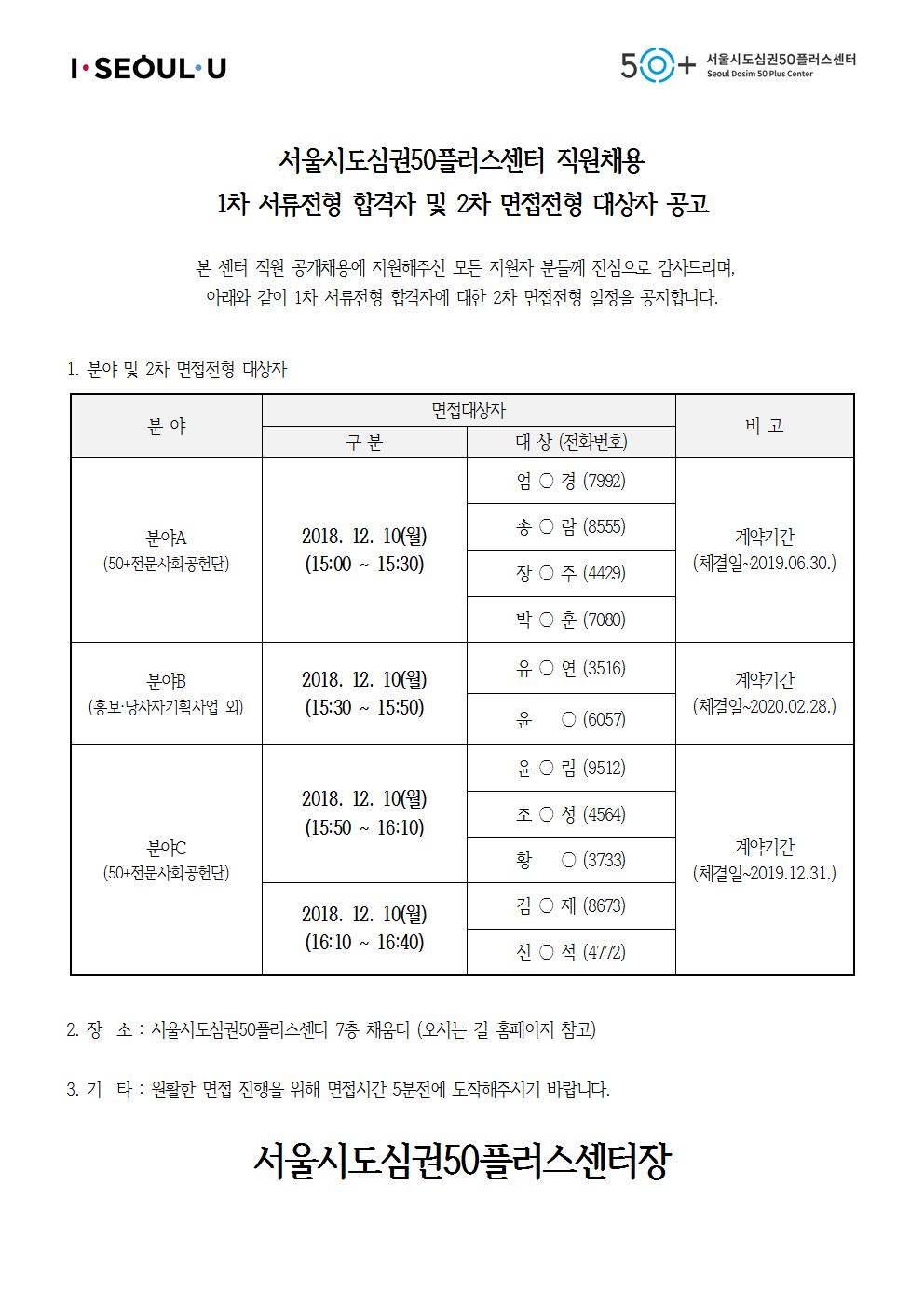 [채용]2018년 서울시도심권50플러스센터 직원채용 2차 면접전형 대상자