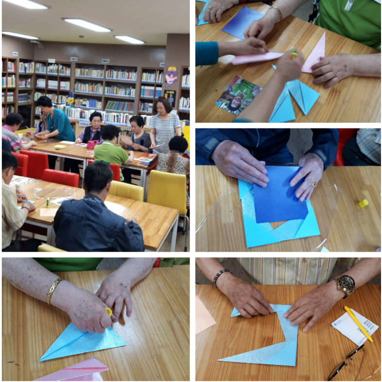 4장씩 나누어진 예쁜 색지를 선생님의 시범에 따라 고이고이 접어 내려간다. 색지를 접는 손에는 비록 연륜의 상징인