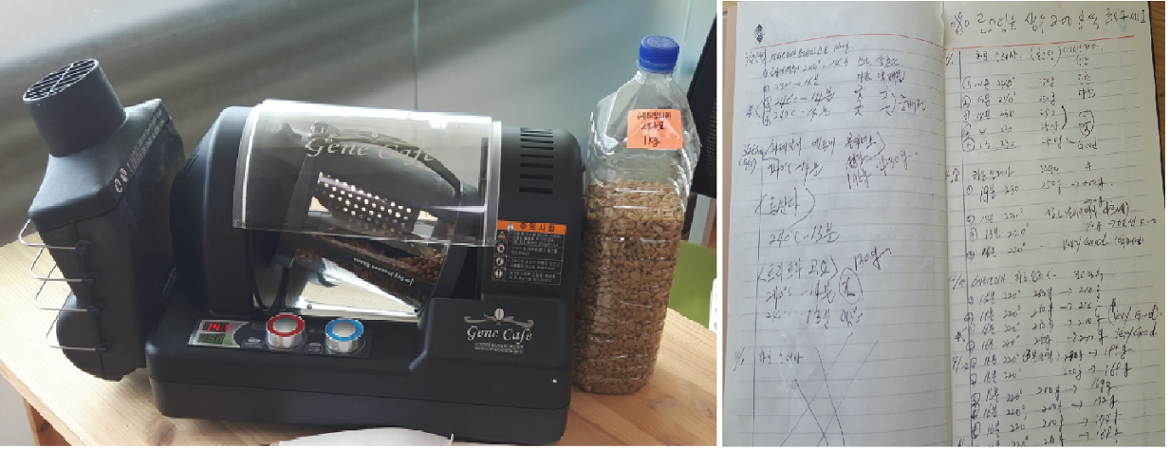 모임 장소는 과학실험실 (원두 로스팅 온도/시간별, 로스팅 전후 무게별, 브랜딩 배합별로 그 맛을 꼼꼼히 기재)