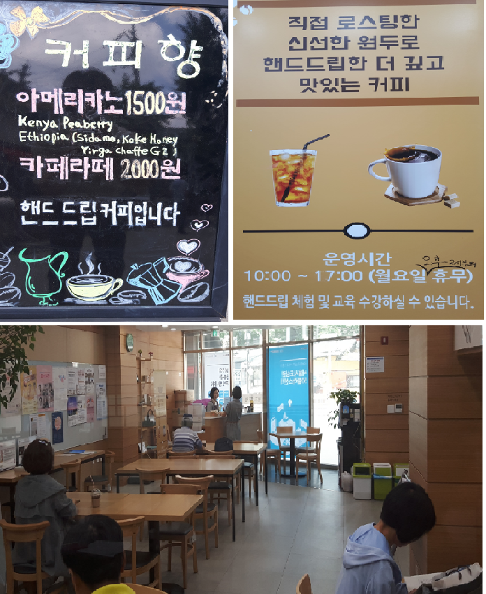 왜냐하면, 도심권 센터를 방문하게 되면 처음 들르는 곳인 활짝 라운지인데, 핸드드립 커피를 판매하면서