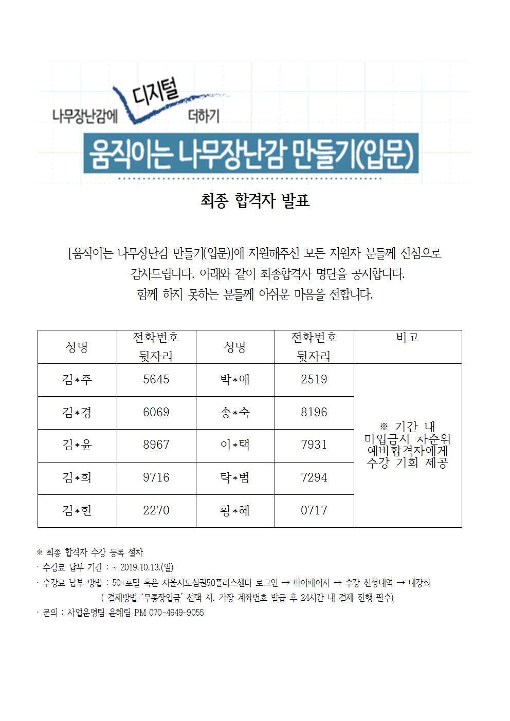 움직이는 나무장난감 만들기(입문) 최종 합격자 발표
