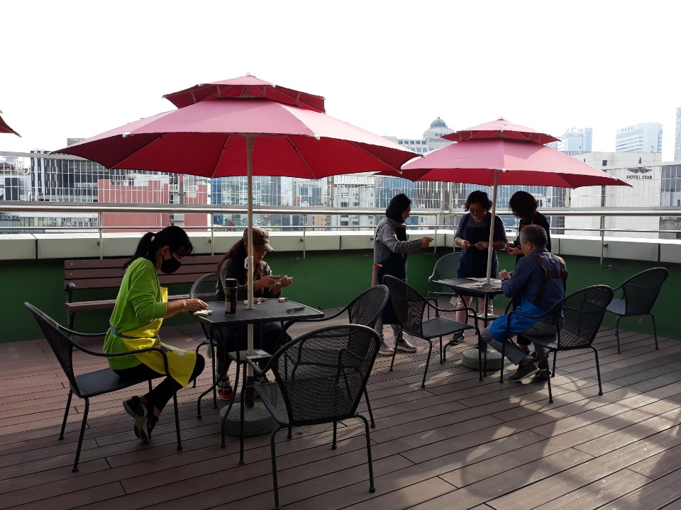 동네 사랑방처럼 야외 테라스에서 오손도손 얘기를 나누며 즐겁게 작업을 하고 있다.