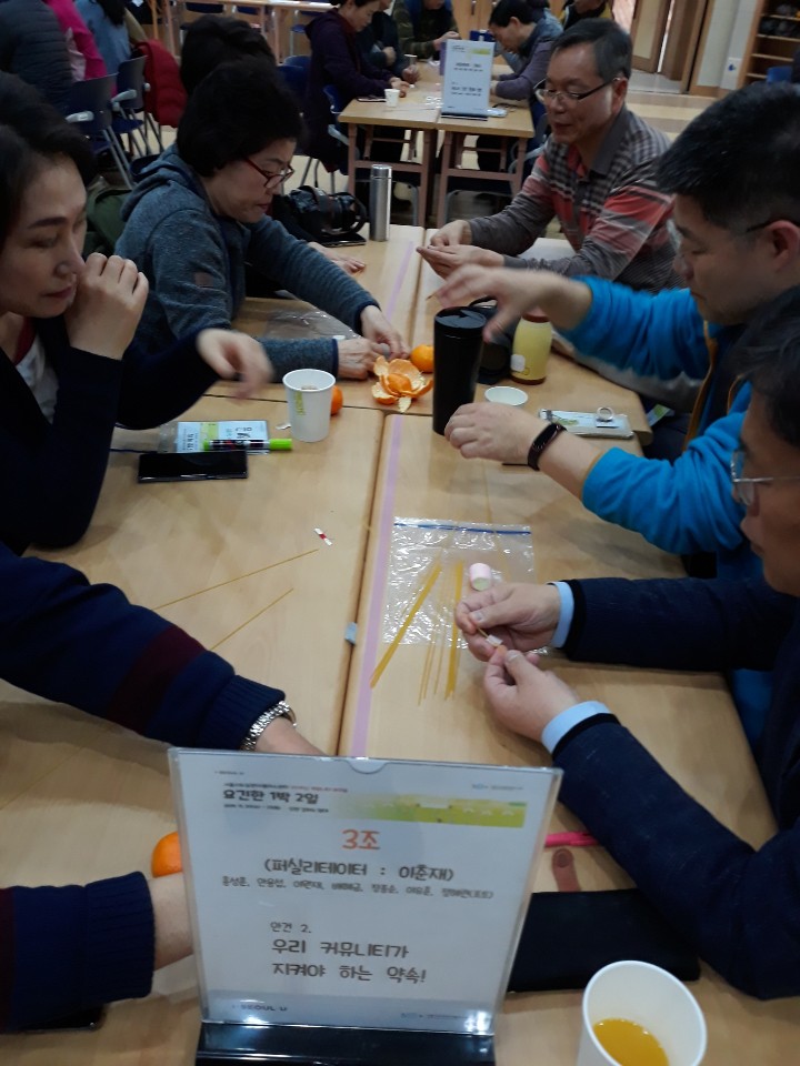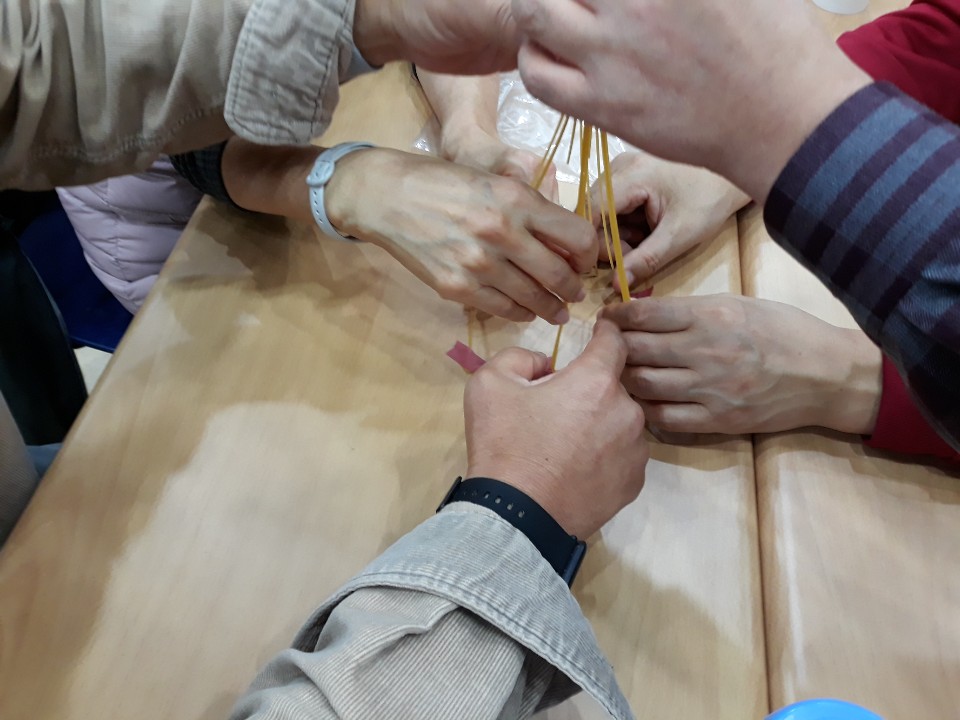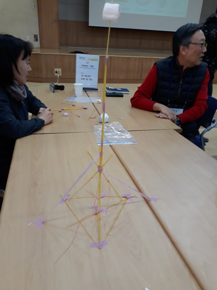 8개 조로, 각 테이블 별로 모여 앉았다. 네 가지 재료 (스파게티 면, 실, 종이테이프, 마시멜로)를 주고 탑을 높이