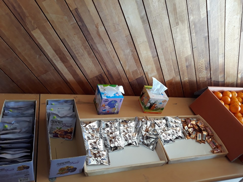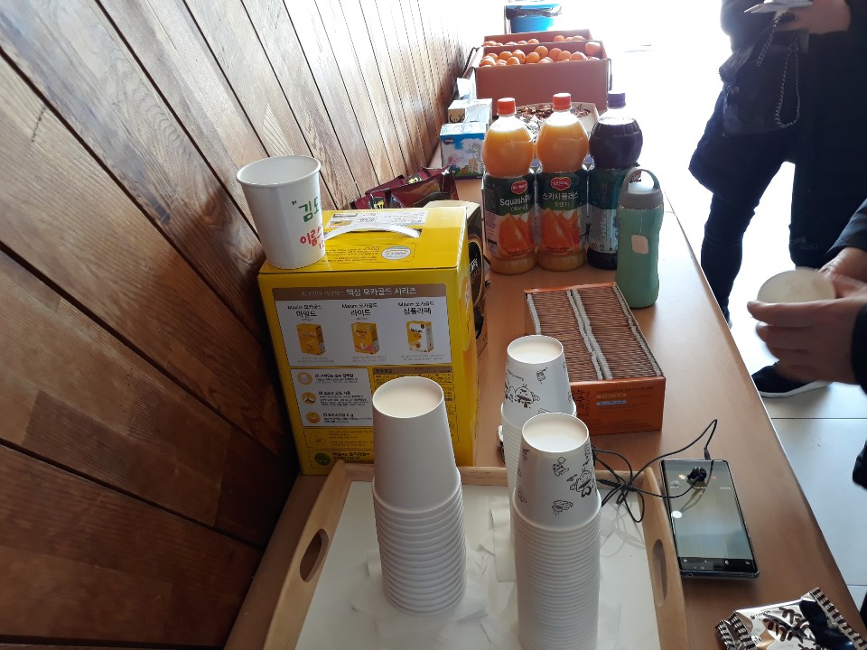 센터에서 정성껏 준비한 간식이 마련되어 있고, 따뜻한 차를 권하며 커뮤니티 간에 우애를 다진다.