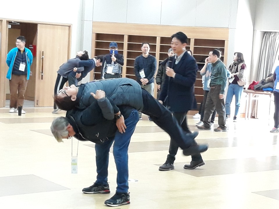 으로 앞사람 어깨에 안마하기, 발로 가위,바위,보 게임을 해서 이긴 사람이 진 사람을 업어주기 등등 ..