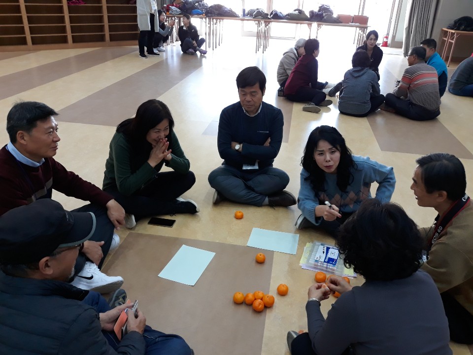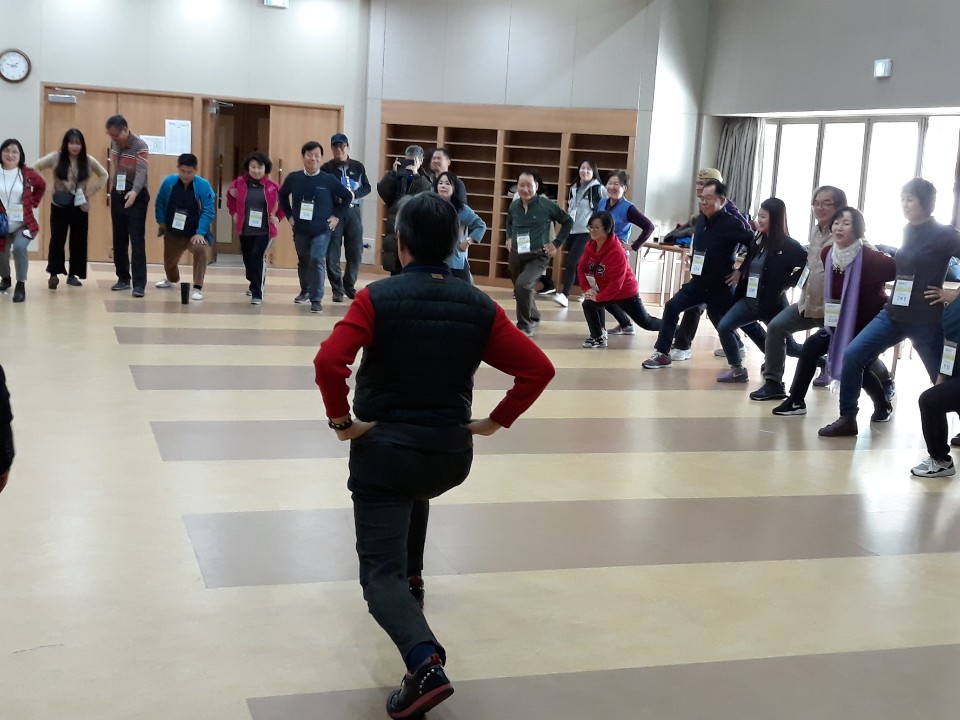 어색하고 긴장된 몸을 체조하며 풀어주기, 두 사람씩 짝을 지어 마주 보고서 손 잡고 인사 나누기, 둥글게 원형