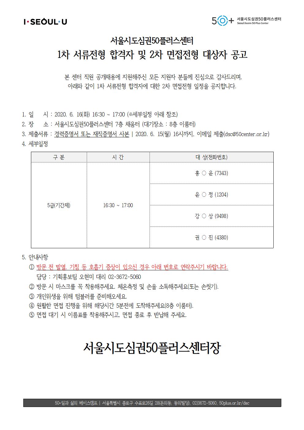 [채용] 서울시도심권50플러스센터 2차 면접전형 대상자 공고