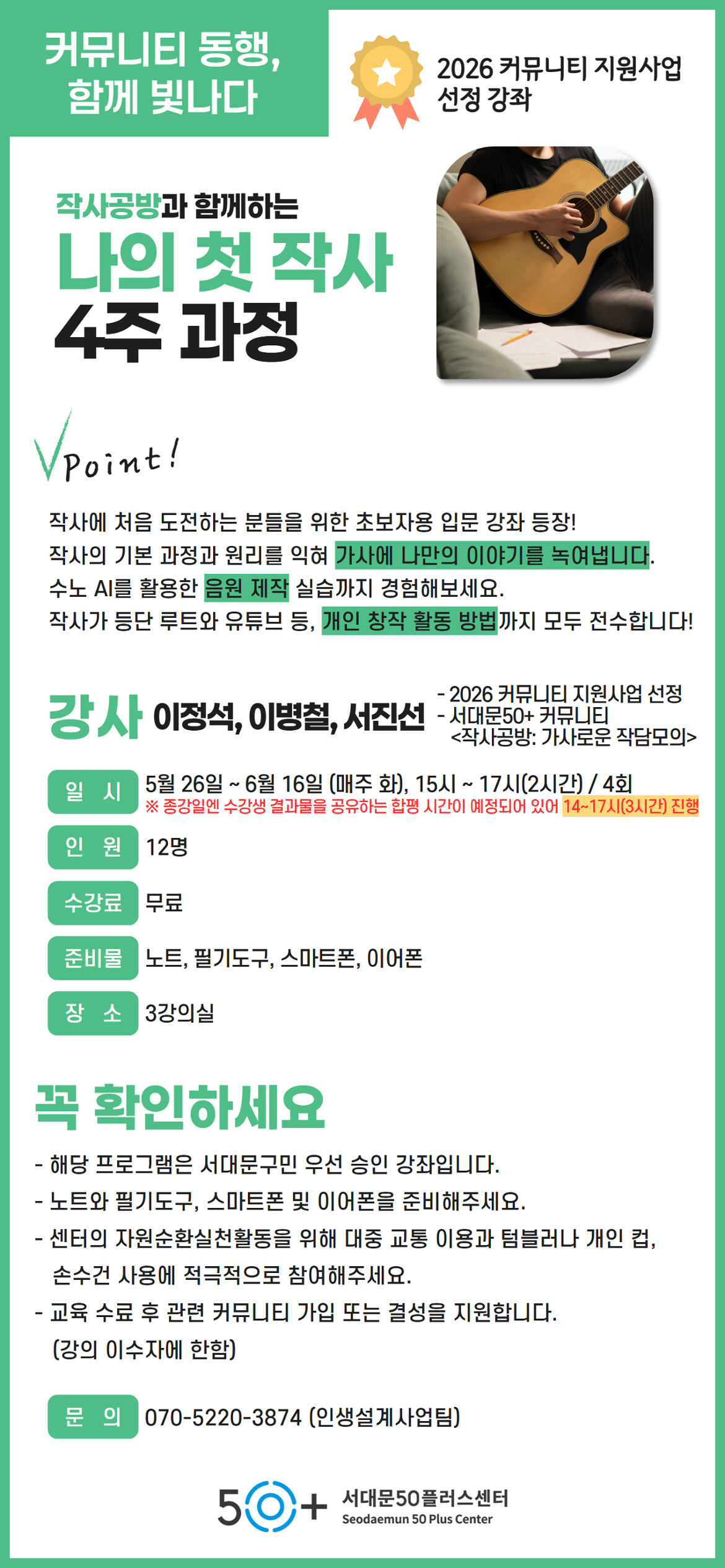 [서대문][커뮤니티 동행, 함께 빛나다] 작사공방과 함께하는 나의 첫 작사 4주 과정 마감 D-47