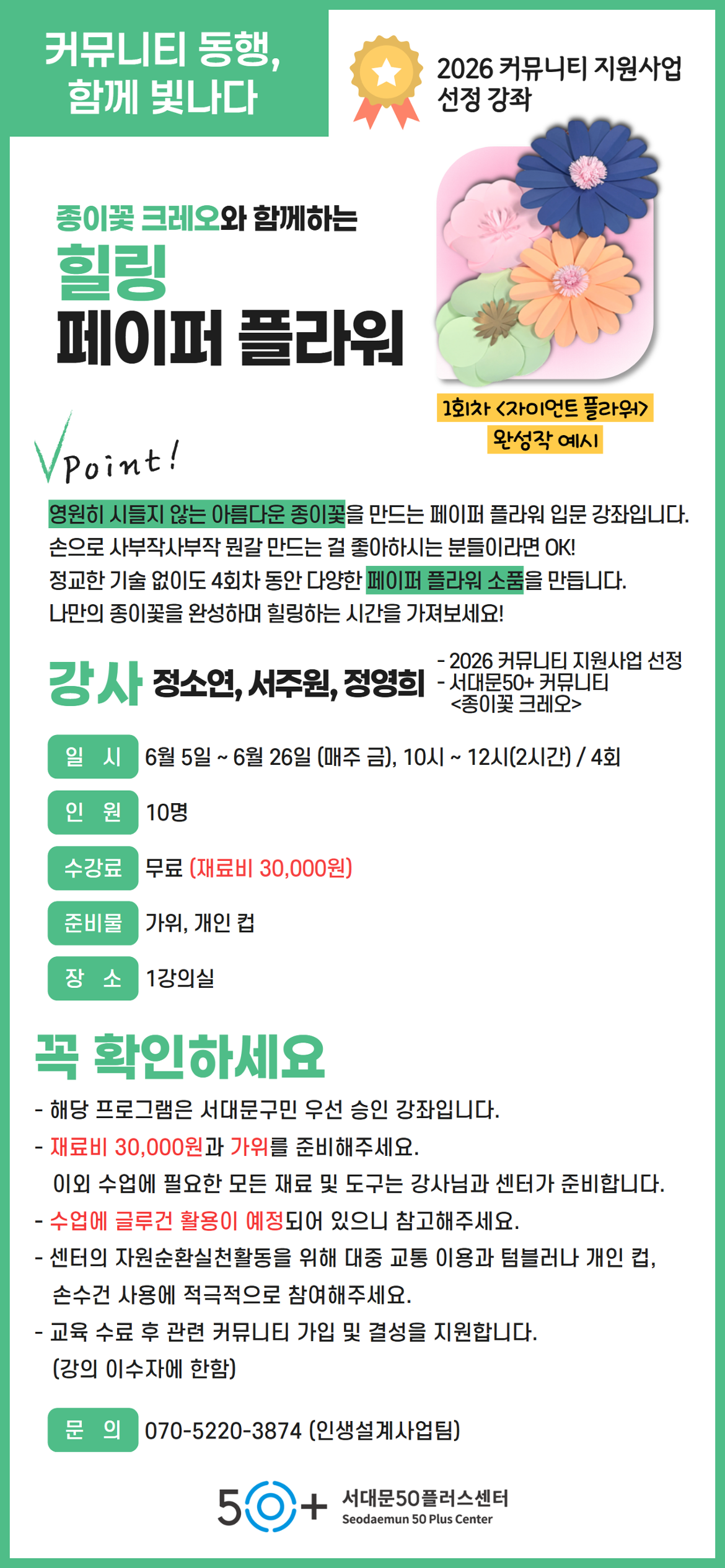 [서대문][커뮤니티 동행, 함께 빛나다] 종이꽃 크레오와 함께하는 힐링 페이퍼 플라워마감 D-53