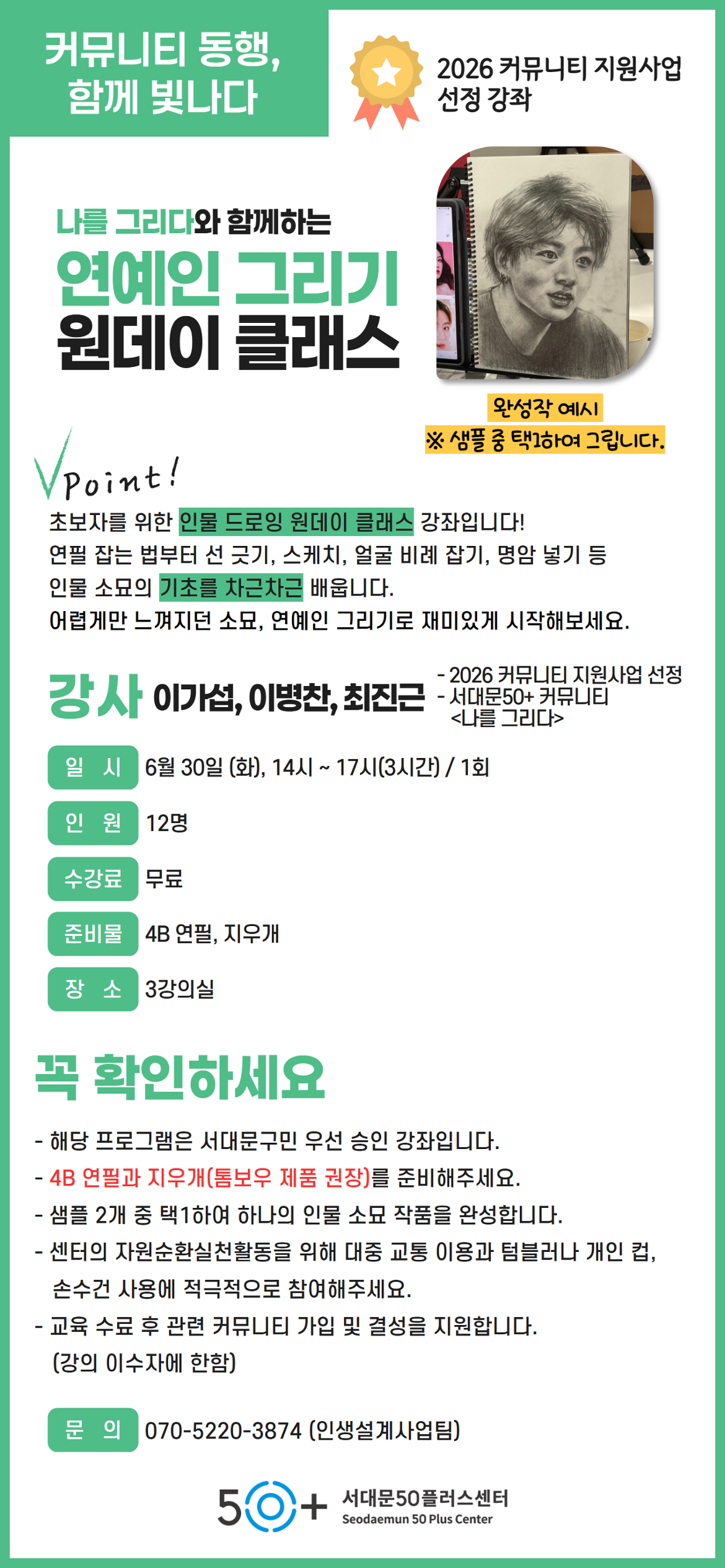 [서대문][커뮤니티 동행, 함께 빛나다] 나를 그리다와 함께하는 연예인 그리기 원데이 클래스마감 D-76