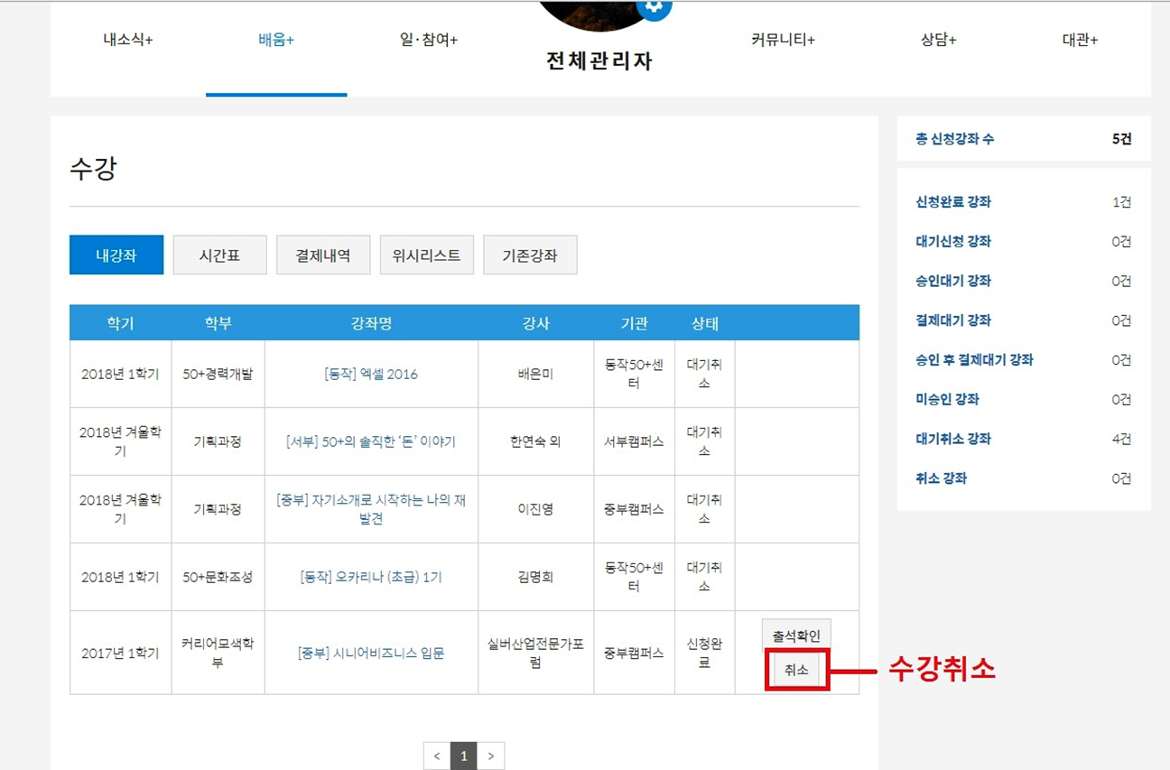 1. 수강취소는 [마이페이지 > 배움+ > 내강좌]에서 취소가 가능합니다.