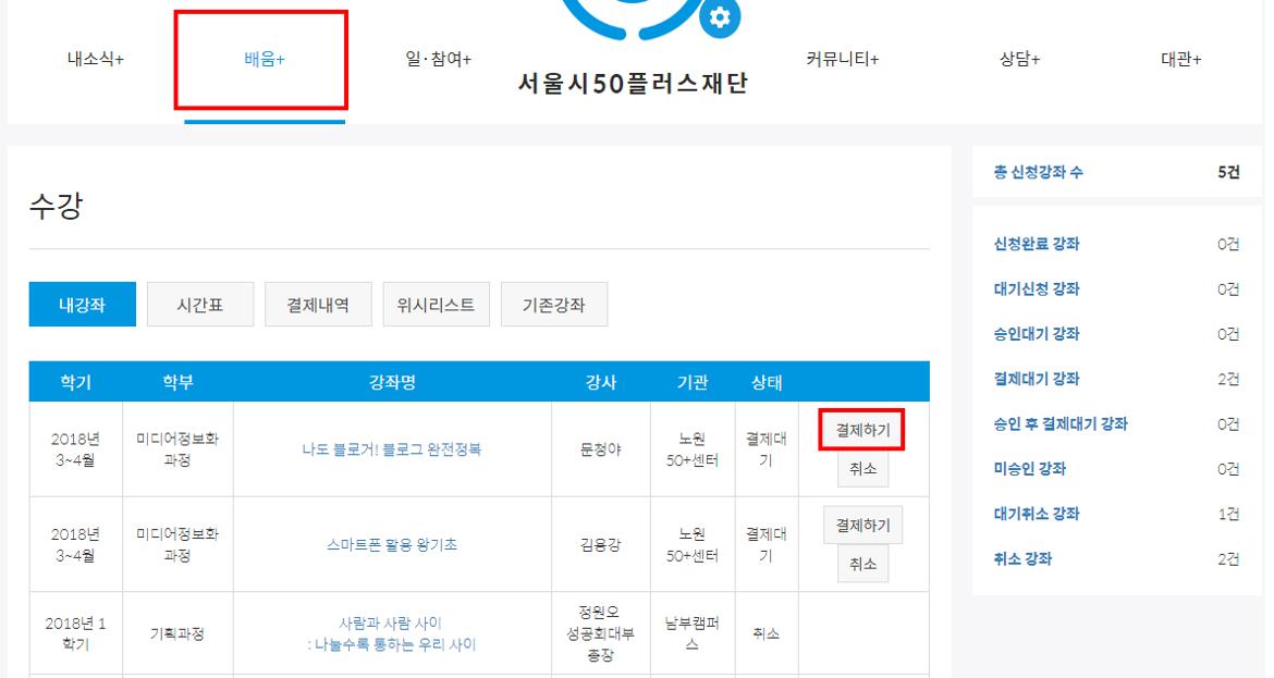 2. 최초 결제 시, 결제완료를 못했을 경우, 통합포털>마이페이지>배움+>결제하기를 통해 재결제를 진행하실 수 있습니다.