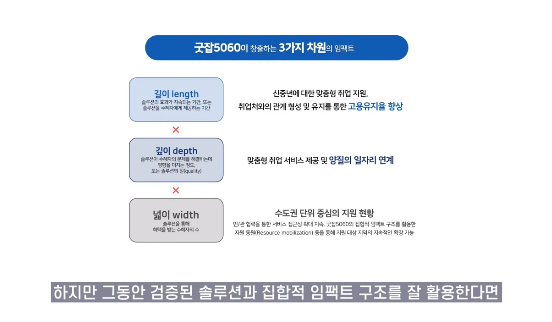 임팩트리서치랩의 대표이사인 한양대학교 신현상 교수는 4월부터 10월까지 굿잡5060의 사회성과 측정 및 집합적 임팩트 평가 연구 수행에 대해 영상으로 발표를 했는데요. 국내 중장년 일자리 수요와 양질의 일자리를 언급하며 양질의 일자리를 발굴 연계하는 굿잡5060의 선발 워크숍부터 개인별 맞춤형 일자리 연계까지 나열하며 임팩트의 세 가지 차원에 대해 설명을 하더군요.