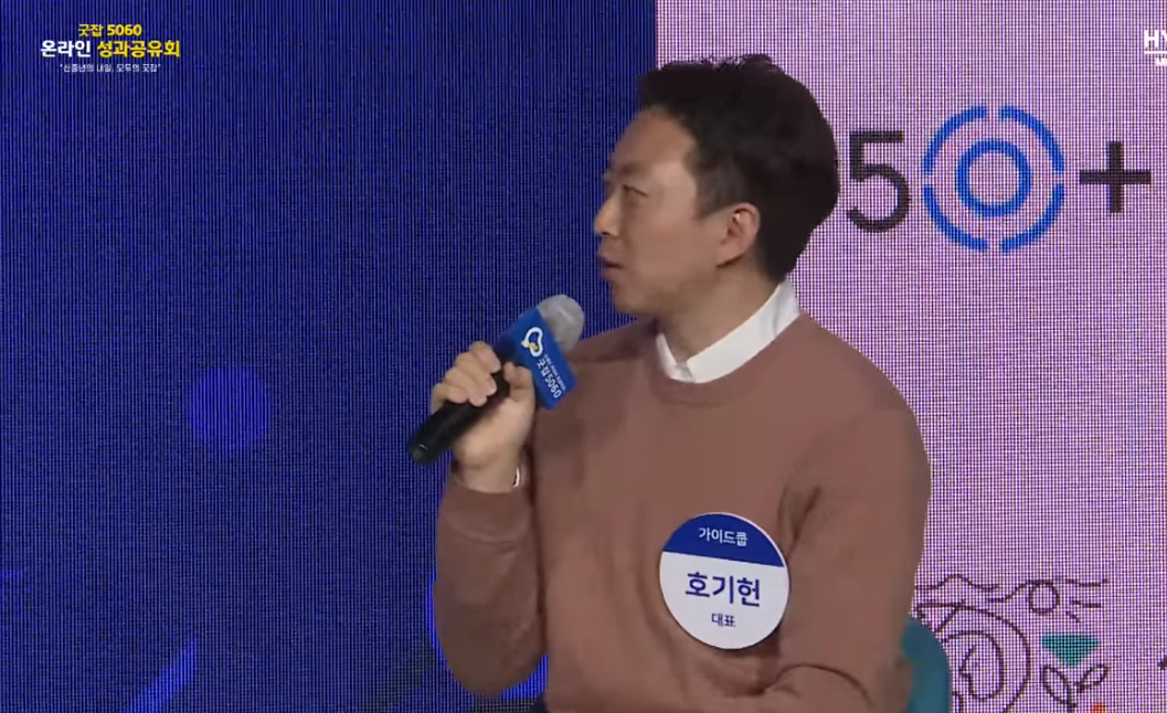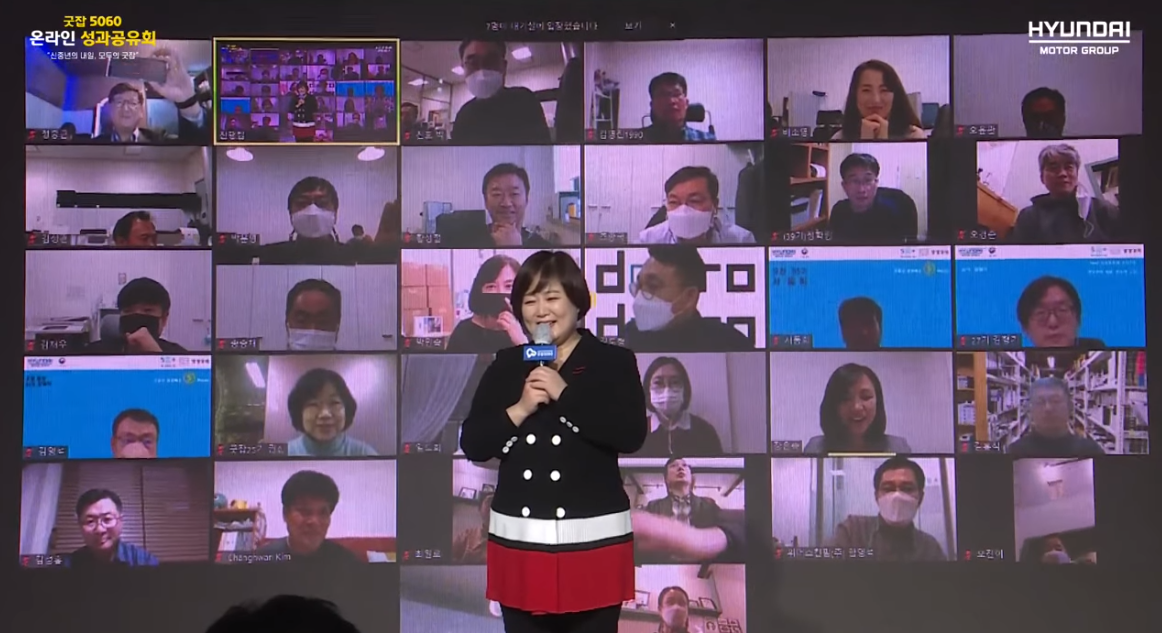 "큐"사인과 함께 성과공유회가 시작되었습니다. 이금희 아나운서는 대본도 없이 능숙한 진행으로 분위기를 띄워주더군요. 비대면 시대에 맞게 현대자동차그룹의 이병훈 상무, 고용노동부 송홍석 국장, 서울시50플러스재단 김영대 대표의 축하를 영상으로 볼 수 있었는데요. ‘위기 속에서 새로운 기회를 만드는 신중년’ ‘지속적인 지원으로 신중년의 내일을 응원한다’는 말이 기억에 남았습니다.